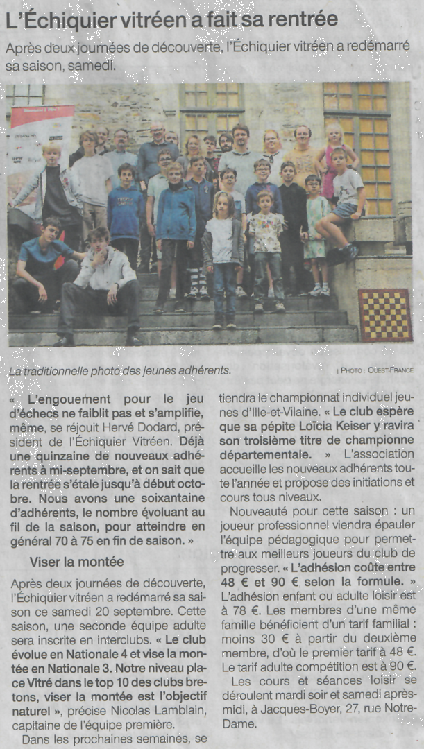 Article dans le Ouest France du 29 septembre 2021 / Une rentrée record pour l'Échiquier Vitréen